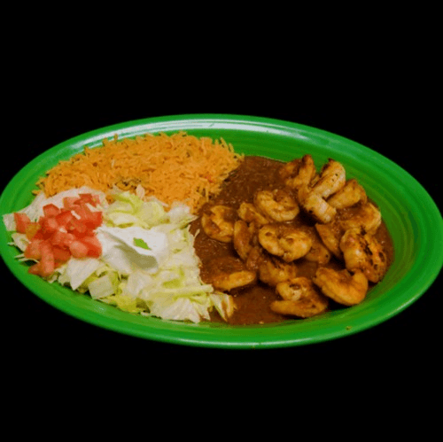 Shrimp sautéed in chile ancho sauce with mushrooms. Served with rice, pico de gallo and sour cream salad