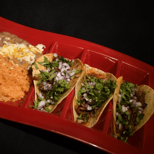 3 pieces. Traditional Mexican dish composed of a handmade tortilla filled with your favorite meat, topped with cilantro and onions. Served with rice and beans